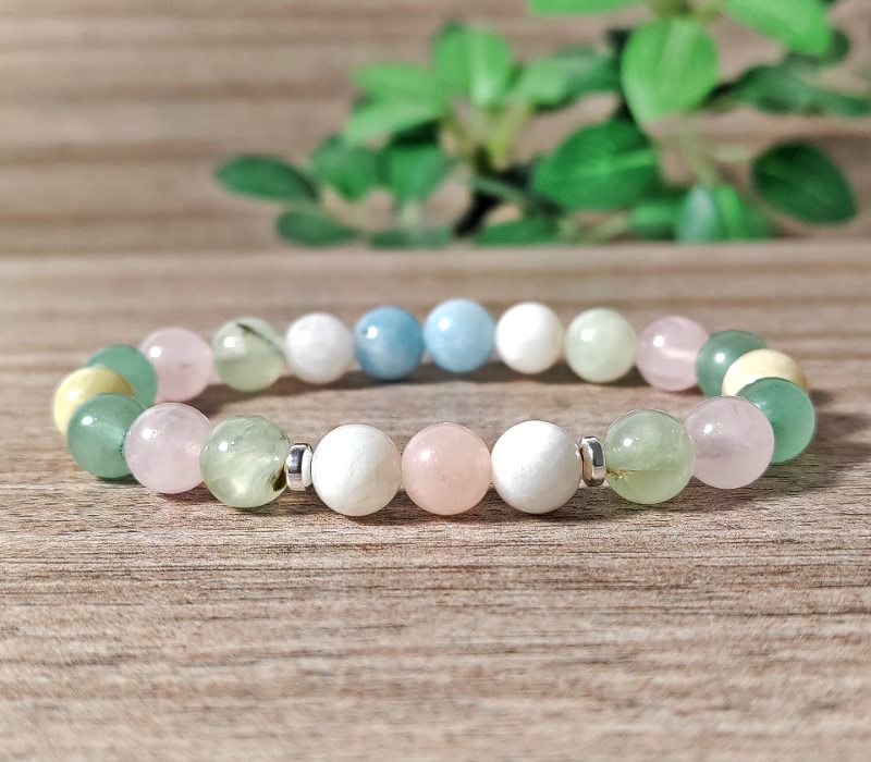 Érzelmi blokkoldást segítő, szeretettel töltekező, belső békét hozó ásvány karkötő, morganittal, holdkővel, prehnittel, rózsakvarccal, aventurinnal és 4 mm-es hematit köztesekkel