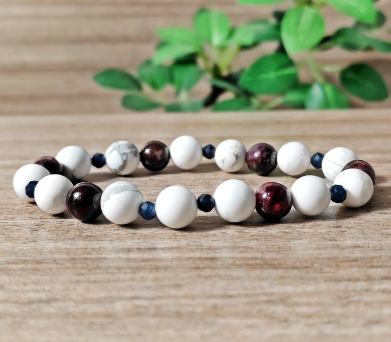 Feszültséget oldó, életerőt és belső nyugalmat harmonizáló ásvány karkötő gránáttal, howlittal és 4 mm-es fazettált zafírral