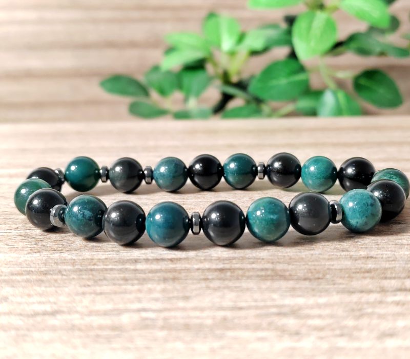 Negatív energiákat oldó, földelő, regeneráló ásvány karkötő mohaacháttal, obszidiánnal, 4 mm-es hematit köztesekkel