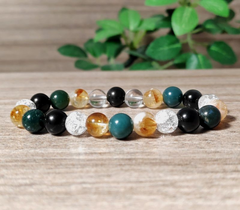 Negatív energiákat oldó, védelmet és életerőt erősítő ásvány karkötő mohaacháttal, obszidiánnal, citrinnel, hegyikristállyal és roppantott kristállyal