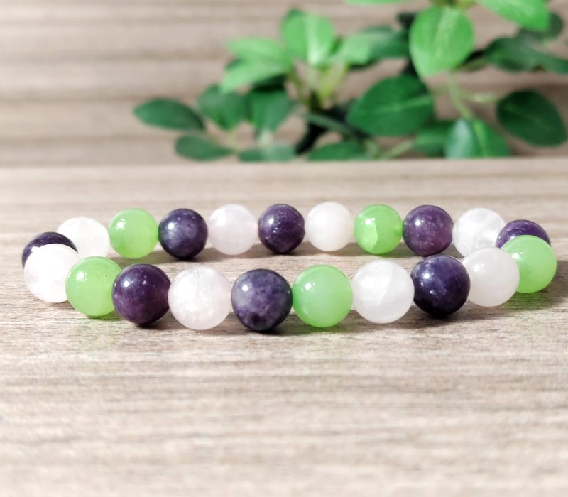 Szeretet erősítő, stressz oldó és pozitív érzelmeket aktiváló ásvány karkötő lepidolittal, rózsakvarccal és olíva zöld jadéval