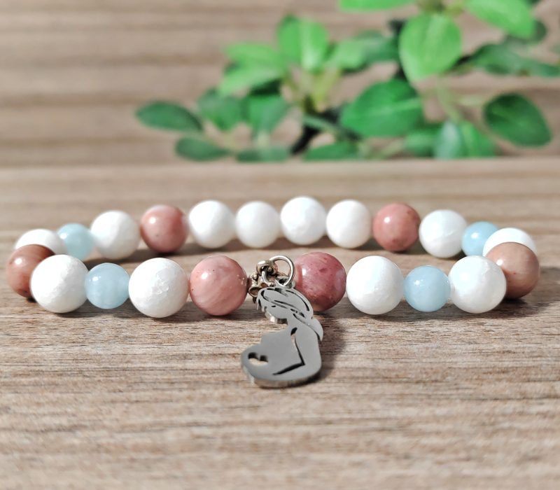 Szeretetteljes babavárást és lelki harmóniát segítő ásvány karkötő rodonittal, tejkvarccal, 6 mm-es akvamarinnal és kismama medállal